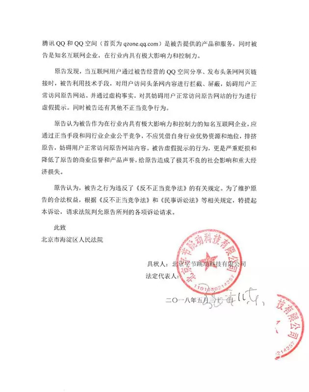 6月2日,今日头条方面正式向北京市海淀区人民法院递交了对腾讯的起诉状,称对方“不正当竞争”,要求腾讯赔偿经济损失9000万元人民币。