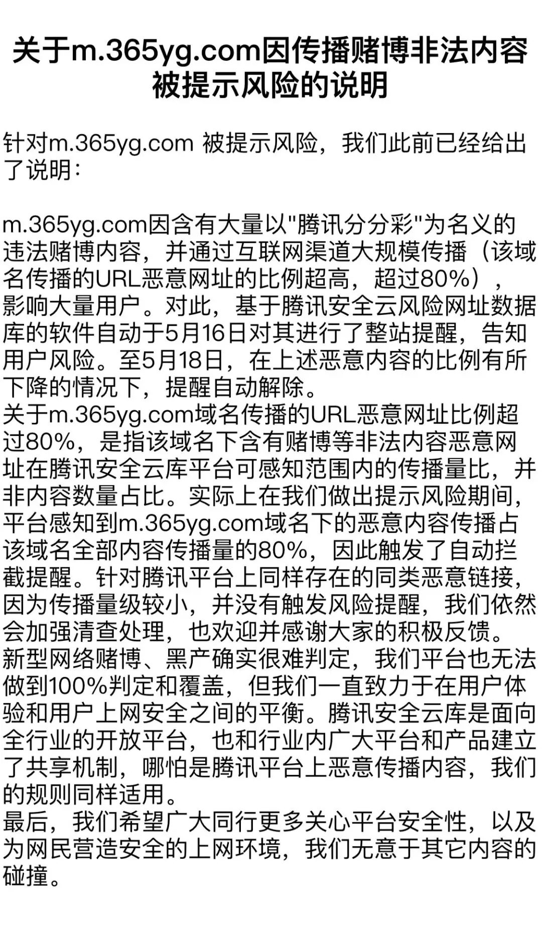 对此腾讯曾回应称,监测到今日头条旗下网站阳光宽频网含有大量以“腾讯分分彩”为名义的违法赌博内容,并通过互联网渠道大规模传播(该域名传播的URL恶意网址的比例超高,超过80%),自动触发腾讯管家安全警告,提醒用户风险。
