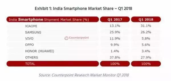 2018Q1印度智能手机市场份额(来源:Counterpoint Research)