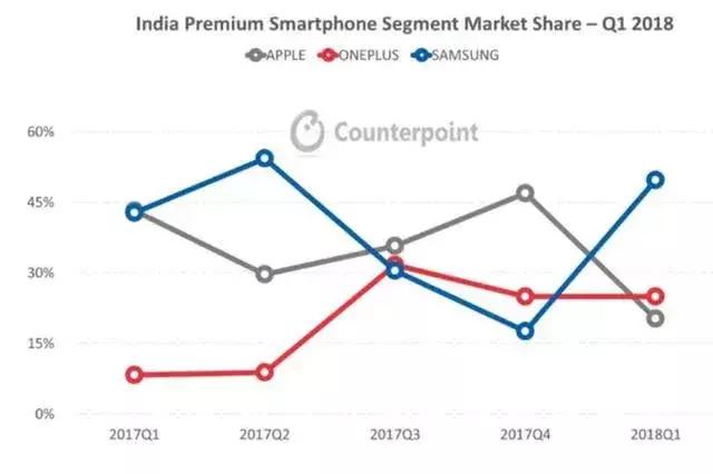2018年Q1印度高端智能手机市场份额 (来源:Counterpoint)