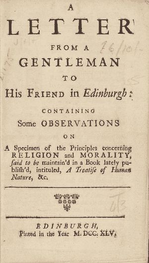 俟爱丁堡大学教席真正空缺已是一七四五年三月二十七日。九个月的时间带给休谟的不是高涨的呼声,反而是众多强劲的对手。此时,代替普林格尔上课达三年之久的威廉·克莱格霍恩是有权执教的人选。除此之外,哈奇森、一七四三年由哈奇森支持获得格拉斯哥大学神学教授的李奇曼,以及爱丁堡大学校长威廉·魏肖特都成为候选人。面对如此劲敌,休谟苦恼万分。他曾寄望于哈奇森的友谊和举荐,然而库茨市长透露给他的风声却是哈奇森实为敌人而非朋友,因为哈奇森可能认为,执掌该教席的人“有义务调和道德哲学和神学”,而且“每周一都要‘宣教’基督教的真理”,休谟并不适合这一职位。这无异于宣称休谟“不宜教育青年”。而爱丁堡的牧师会更是极力反对,将休谟当作“异端、自然神论者、怀疑论者”,甚至“无神论者”。魏肖特校长将《人性论》斥为“异端学说”,列出六条“罪证”,如“普遍的怀疑主义”“无神论”“否定上帝”“关于上帝创世的谬论”“否定灵魂的非物质性”“颠覆道德体系”等,而这些被爱丁堡牧师会拿来肆意发挥。为此,休谟匆匆草拟了一封答复信,即《一封绅士的信》,首次为《人性论》第三篇的道德哲学体系辩护。