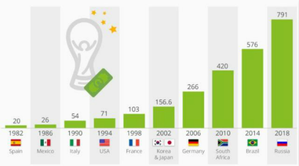 足球是世界第一运动,而世界杯也是最受关注的足球赛事,因此世界杯的奖金收入也颇高。国外媒体《soka25east》在近日也对最近30多年来世界杯的奖金进行了一次统计,本届俄罗斯世界杯,FIFA开出的奖金总额为7.91亿美元,而冠军球队会得到3800万美元的奖励。
