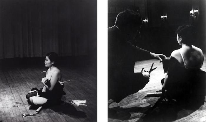 躺在床上,还有很多类似的夫妻概念,都被嘲笑过于简单了。有点像贺曼(注:一家主营贺卡、文具的公司)的风格,也有一点禅的味道,但是不像是真正的艺术。在当时,概念艺术还没有今天这么流行。1964年,小野洋子表演了行为艺术作品《切片》,观众可以随时过来剪掉她的衣服,她试图以这种带有仪式感的方式表达性别、身份、脆弱和异见,这比阿布拉莫维奇那场著名的“韵律0”早了十年。她拍摄了电影《强奸》,她在艺术中非常善于使用裸体,她对原始尖叫疗法很感兴趣,她坚持认为每个人都可以成为艺术家,她认为艺术永远都是由观众创造的,重要的是互动而不是展品——现在看来,小野洋子的观念完全是当代艺术的理念,列侬也深受她的影响。