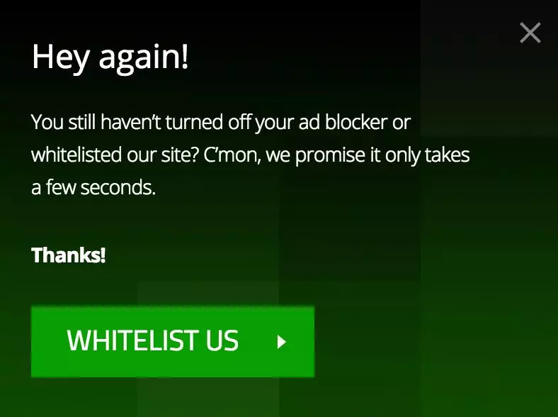 这么看来,横空出世的 AdBlock 不就把人家的路给档了嘛?!所以很多内容平台不得不在察觉到用户用 AdBlock 后,一次一次地跳出弹窗,让用户把 AdBlock 关了: