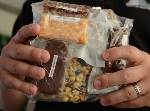 (5月24日在五角大楼展出的战斗口粮包括一个酸樱桃坚果能量棒,切达干酪能量棒,摩卡能量棒,还有真空干燥的草莓以及水果和坚果的混合搭配的能量棒)(Gary Sheftick / 来自美国部队)
