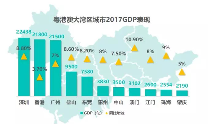 2017年,粤港澳大湾区“9+2”城继续朝着世界级大湾区阔步前进。其中,“广深港”三地GDP均突破2万亿元,在“广深港”三足鼎立的情况下,粤港澳大湾区经济呈现多极化趋势,出现多核区域龙头。