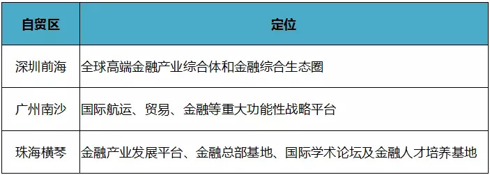 粤港澳大湾区协同共建金融核心圈,建设全球金融枢纽,形成以香港为全球金融中心,以广州南沙、深圳前海、珠海横琴三个自贸区为节点的大湾区金融核心圈。