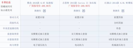 在其他配置方面,三款车都配备了ESP车身稳定系统的情况下,红旗L5的安全配置最低,然而古斯特的配置最丰富,比其余两款车多了自适应巡航、全景天窗、方向盘记忆、HUD抬头数字显示等少数配置,不过总体来看还是慕尚和古斯特配置比红旗L5丰富了很多。