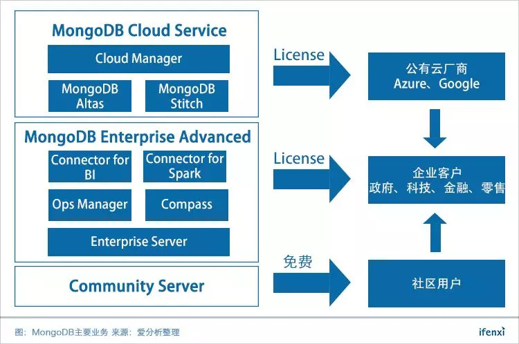 另一款营收产品,MongoDB Atlas,是与公有云服务厂商合作,MongoDB自身团队为客户部署的云数据库。同时提供MongoDB Stitch,帮助开发者完成数据库后端架构,简化数据库应用开发过程。