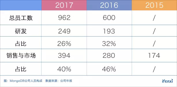 从表中可以看出,作为以技术作为主要竞争力的数据库产品,MongoDB仍然保留了一支规模较大的研发团队,但是随着产品的不断完善以及稳定,这支研发团队的扩张速度也在相对放缓。