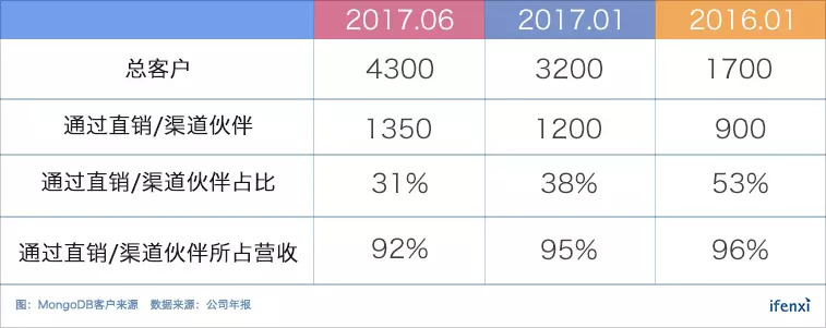 由于Atlas的上线,用户可以通过自助的方式在网站上选购需要的数据库产品,MongoDB总客户群体中,通过直销或者渠道伙伴所获取的客户数量占比在不断降低。
