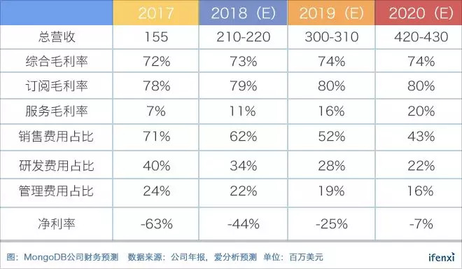 随着MongoDB两款主要产品的不断完善以及非关系型数据库市场规模的扩大,根据ARR扩展率以及新老客户营收增长占比测算,爱分析认为,未来3年MongoDB营收增长速度将在40%左右,预计2020年总营收将达到4亿美元左右。