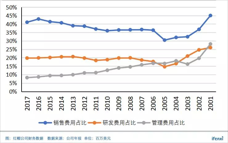 这一成本结构占比,我们可以与在开源商业化道路上取得巨大成功的红帽公司进行验证对比。之所以选择红帽公司进行对比,一方面,红帽公司的商业模式(订阅+服务)与MongoDB基本相同,成本结构具有参考意义;另一方面,红帽和MongoDB所在市场(Linux与NoSQL)都是增量市场,并且两者都在各自的市场中处于领先地位。