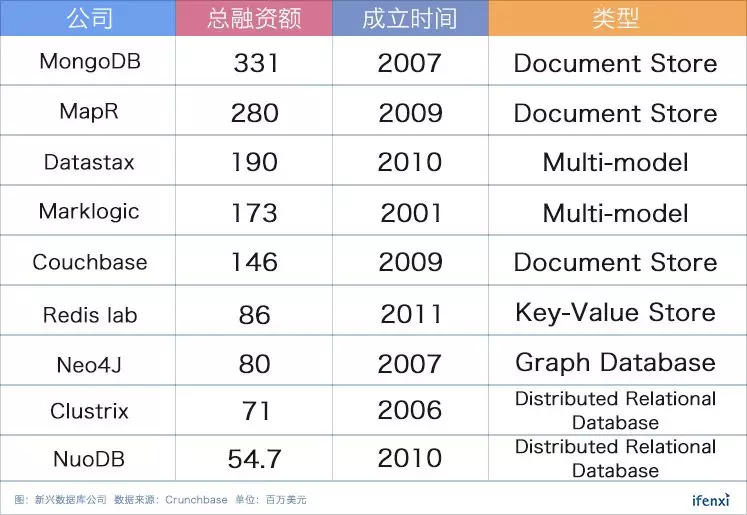 这些新兴的数据库公司的产品大部分为非关系型数据库,其中两家关系型数据库也是带有分布式特性的。公司的总融资额都达到了5000万美金以上,可以看出市场对于这些分布式数据库公司的前景非常看好。头部公司(MongoDB、Datastax等)的营收在最近几年也都陆续超过一亿美元。