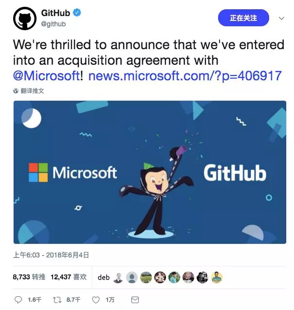 6月4日,微软发布公告称,将以75亿美元的微软股票收购GitHub,GitHub官方推特转发确认了这一消息。