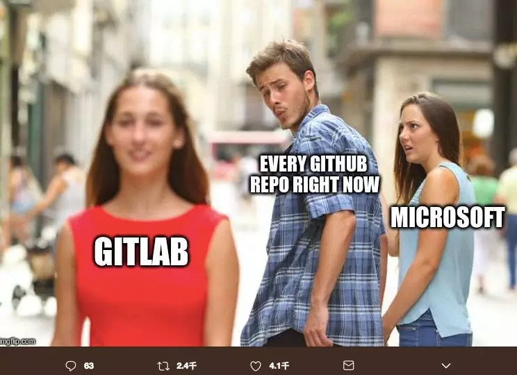 这同时引起了程序员群体的恐慌和diss,Gitlab是Github的竞争对手,Gitlab的数据显示6月3日至4日间迁入代码上涨了5倍,同时,Gitlab将费用降低了75%来加速代码迁移。同时,舆论上,海内外各种调侃的段子以及图片流传开来。