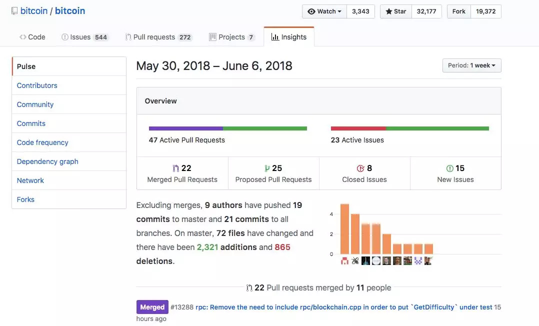 左下角会有一个总体的信息摘要,如图翻译:“不包括合并,9位作者推动了19次提交,并向所有分支提交了21次提交。在主文件上,有72个文件已经更改,并且有2,321个添加和865个删除。”并且你可以看到每位代码贡献者的头像以及他们代码提交的数量对比。