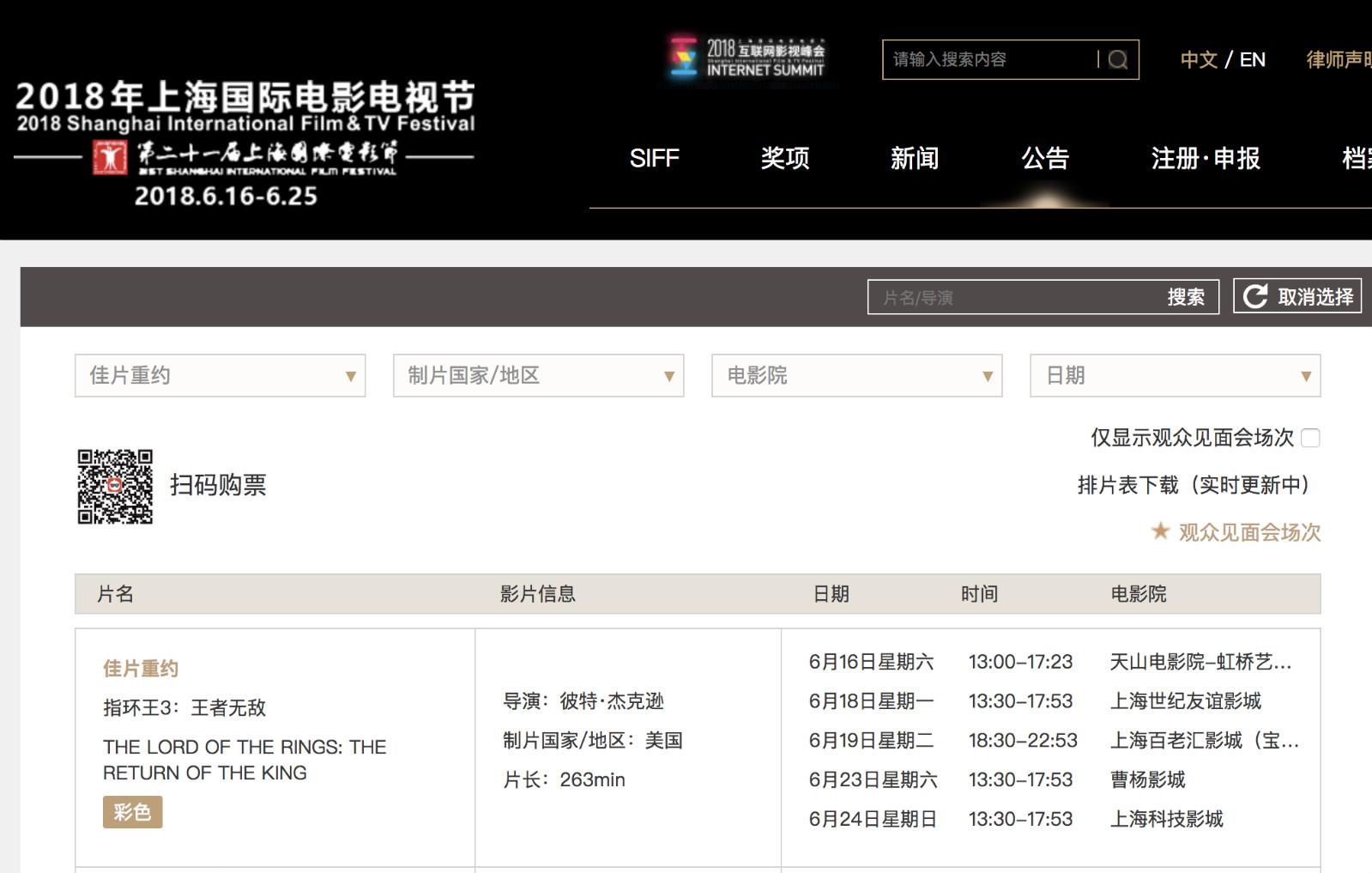 目前排片表已在电影节官网(http://www.siff.com )上线,影迷进入官网后,可以选择右上方的“公告”,点击“排片表”。在官网的排片表内,影迷可以按日期、影院等内容进行搜索,或输入片名搜索,得到相应的排片内容。