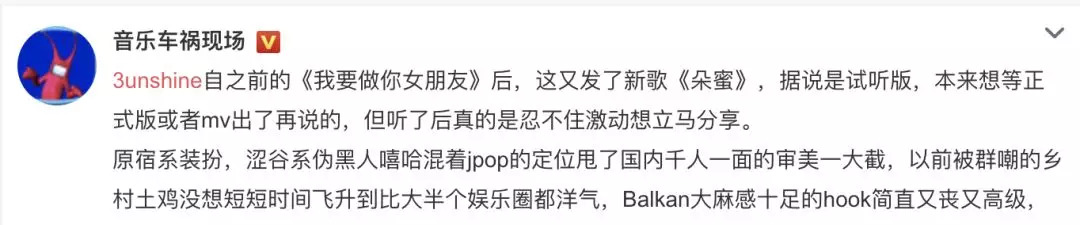 来看看 @音乐车祸现场 对于3unshine歌曲《朵拉》的评价。