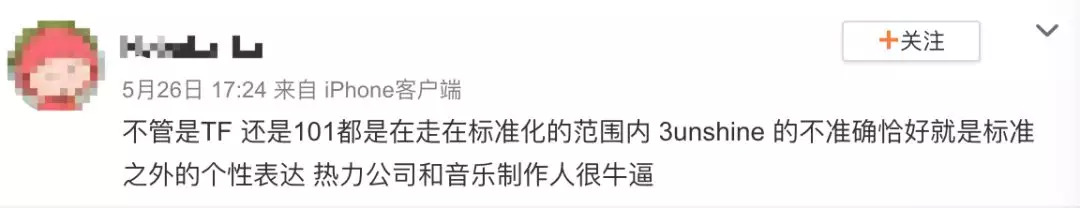 3unshine也是。微博上的几位音乐大V,@耳帝、 @呆若木一 和 @音乐车祸现场 不约而同的先后对3unshine表示过赞赏。从文字上看,表达都是积极的。比如耳帝就表示“我从不掩饰我对3unshine的喜爱。”