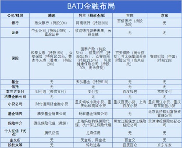 分业务板块来看,对比四家互联网巨头的板块和牌照,蚂蚁金服和腾讯属于第一梯队中相差较小的两只队伍,业务板块和牌照只是巨头们打开开放的基础设施。