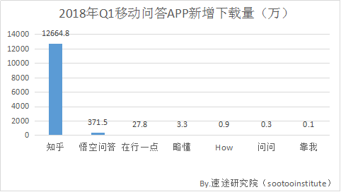 在2018年第一季度新增下载量的统计中,知乎不出意外遥遥领先其他平台,新增下载量达到了12664.8万次;悟空问答排在第二位,下载量为371.5万次,上升势头明显。在头部平台的压制下,其他小平台的发挥空间已经很小。
