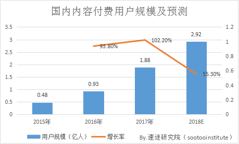 根据数据显示,2017年国内内容付费用户接近2亿人,也是增长最快的一年,增长率达到102%以上,预计2018年内容付费用户规模会达到3亿人上下,占中国网民规模的三分之一左右,然而增长率可能会下降到55.3%,增长空间逐步减少。