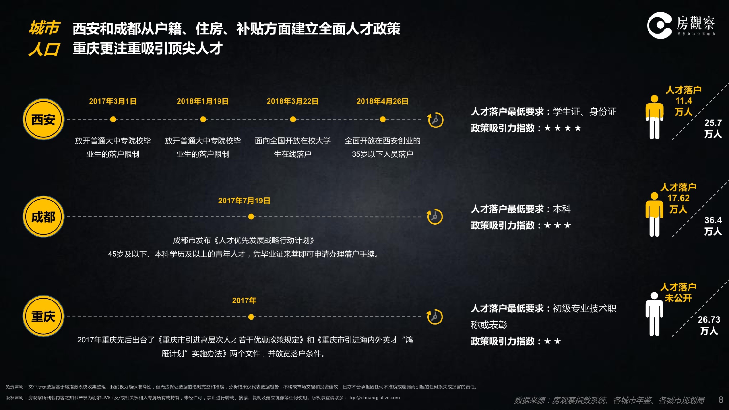 自2017年3月起至今,西安共先后出台了4项人才落户政策,人才吸纳范围由普通大中专院校毕业生扩大至在校大学生及35岁以下创业人员,在 “人才大战”中仅2017年新增人口数量即高达25.7万人。