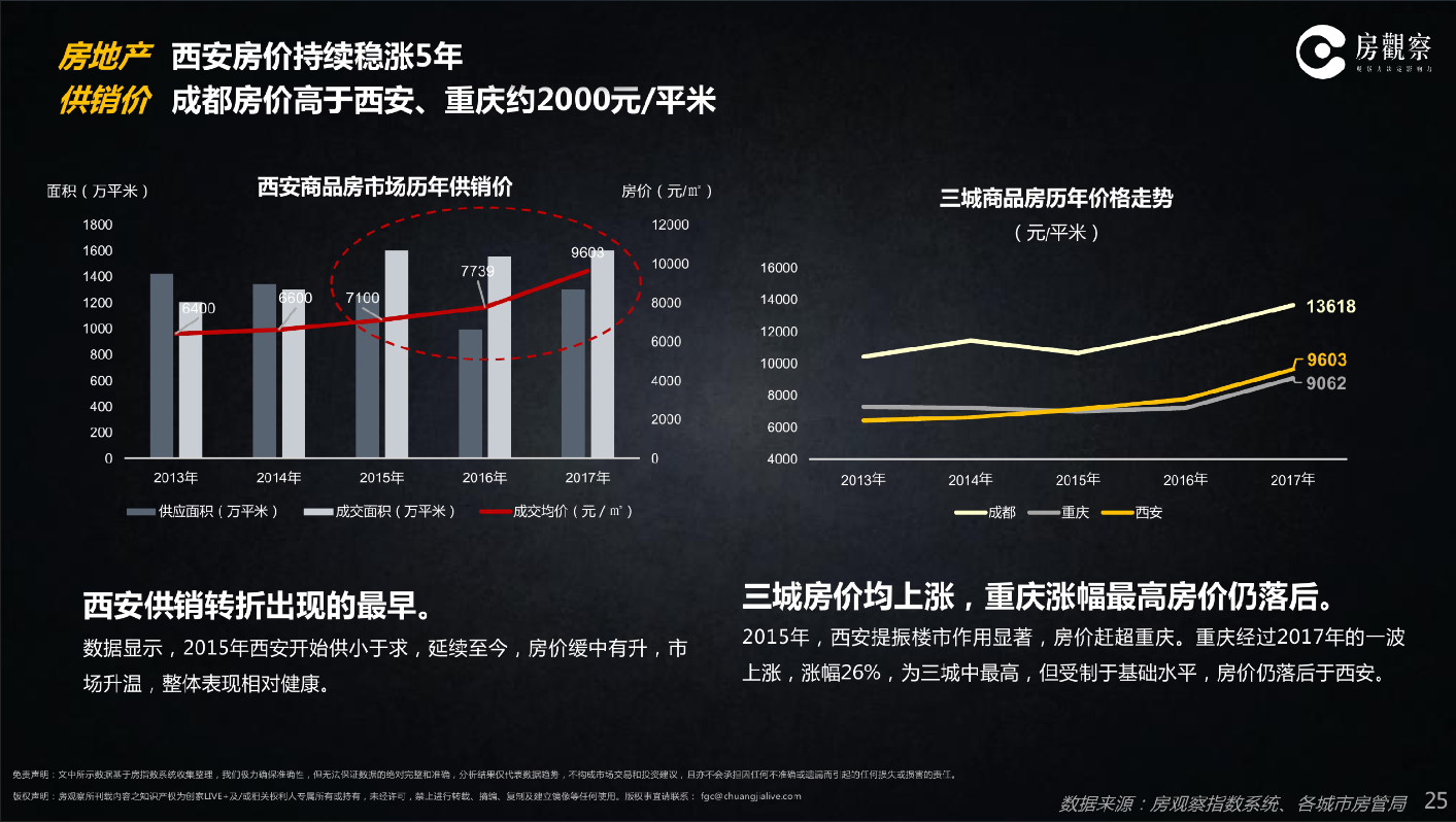 自2016年开始,西安、成都两市先后进入国家中心城市建设、自贸区建设、“一带一路”战略重要城市建设等多项历史机遇叠加的黄金发展期,与此同步,西安商品房供应量一改自2013年起连续4年下滑的态势,2017年成交量、成交均价均达到近5年来的峰值,分别为1600万㎡、9603元/㎡。