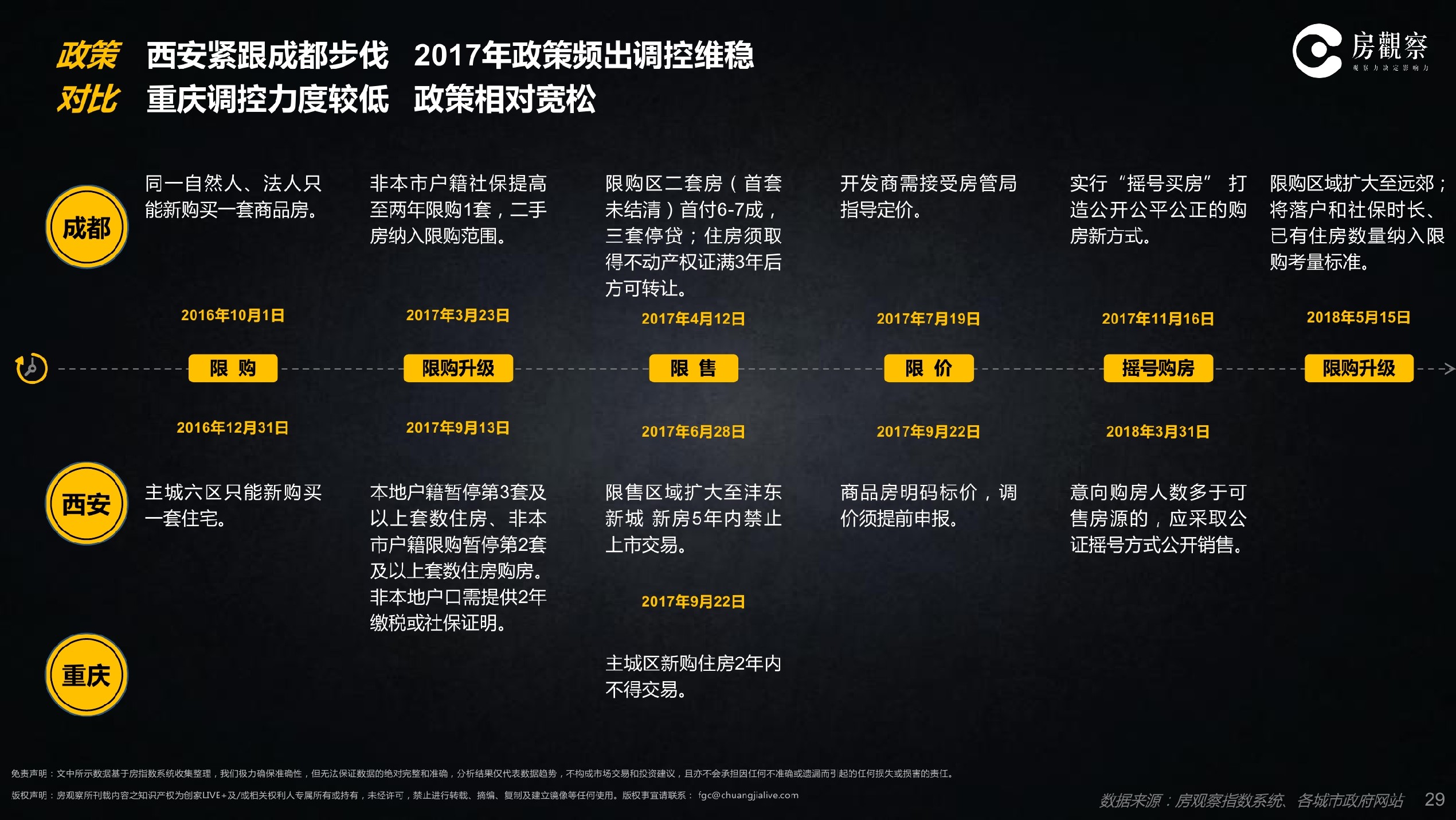 除此之外,西安、成都已分别在限购、限售、限价、限贷4个层面因城施政,并先后启动摇号选房,管控相对严格;重庆市场稳定、管控相对宽松,仅规定主城区新购住房2年内不得交易;三城对比,成都限购政策下,购房的准入门槛最高。
