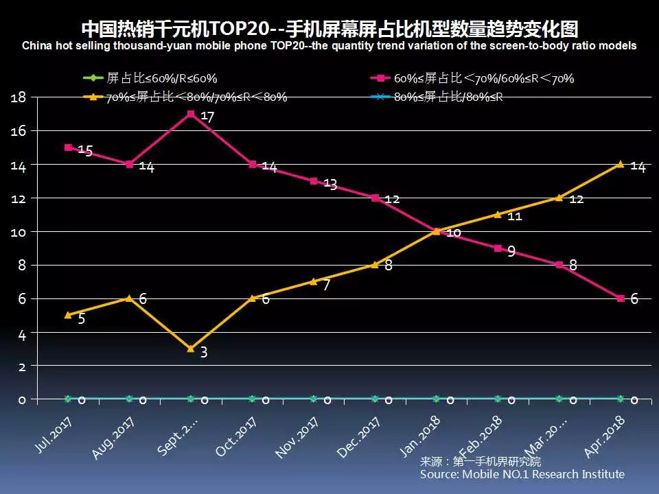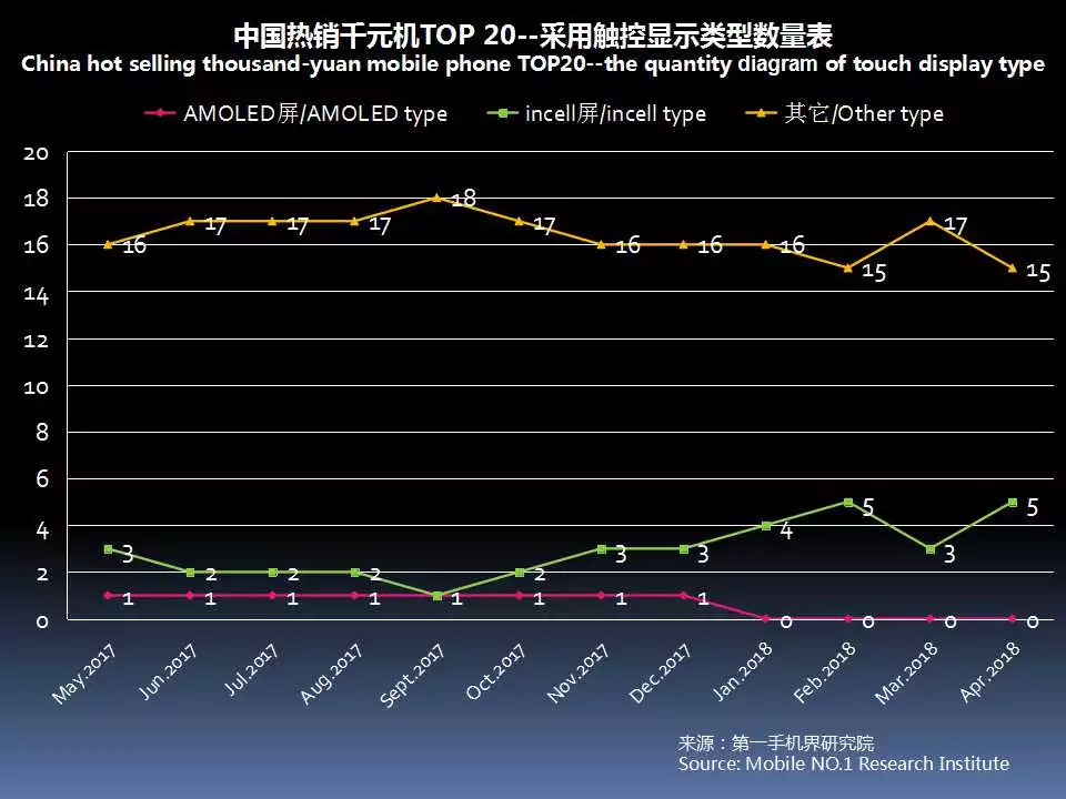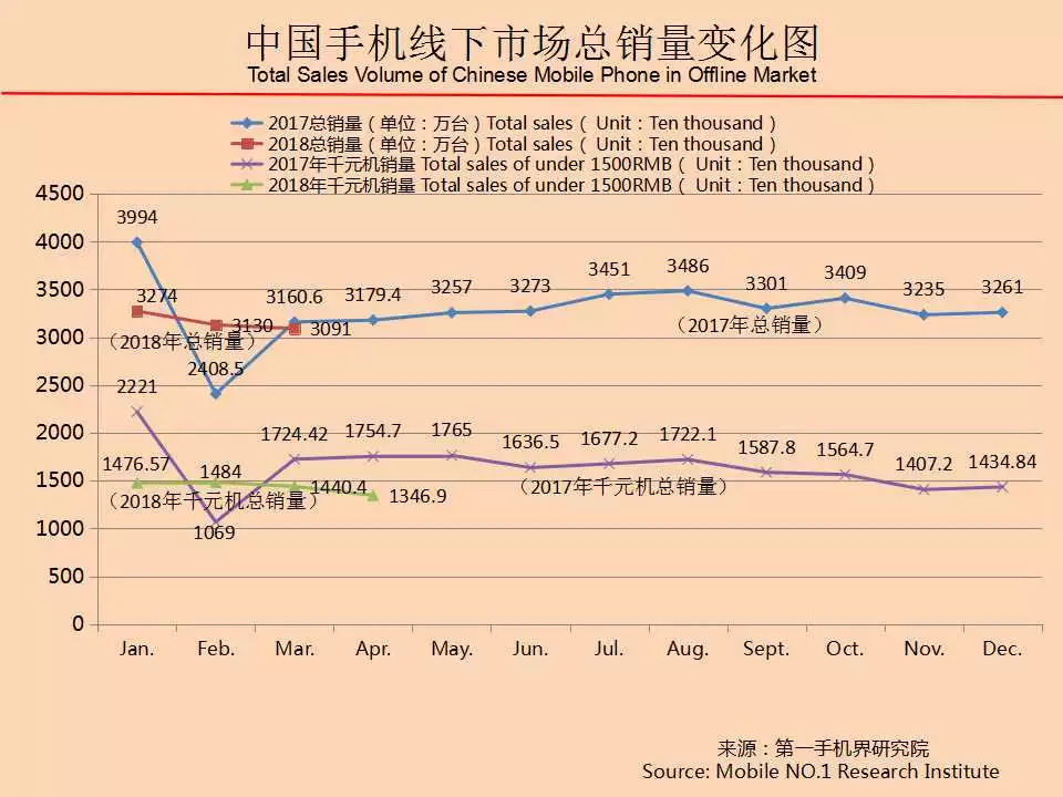 根据七星手机连锁、话机世界、广西王者通讯、四川龙翔通讯、广东丽的通讯、广东新星源手机数码连锁、黑龙江省凌志手机连锁、海南王者天创、山西太通科技、山西远大通讯、湖南齐欣通讯、江西丽华通讯、湖北九鼎通讯、吉林天天手机、云南九机网、甘肃悦达、陕西中人、河南兄弟通讯商会、河南国宇、河南胜天、江苏国网、河北润德、厦门中桥、迪信通、贵州诚讯、华伟通讯、大地通讯、重庆祥佳音、河北国通等全国手机连锁卖场销售数据统计结果显示,2018年4月中国线下渠道销售的千元机手机品牌仅有15个,与2018年3月环比减少了5个;有一定销售的手机机型维持在29款。