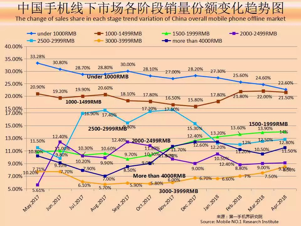 按照1500元以下的机型归为“千元机”的原则,根据覆盖全国25个省/直辖市/221个城市,10034家线下手机实体店的销售数据统计。结果显示,2018年3月,中国大陆整体手机线下市场共完成千元机销量1346.9万台,占整体线下市场销量比重达46.6%,环比2018年3月下滑了2个百分点,主要是因为1000元以下销量份额下滑至历史新低的22.6%。