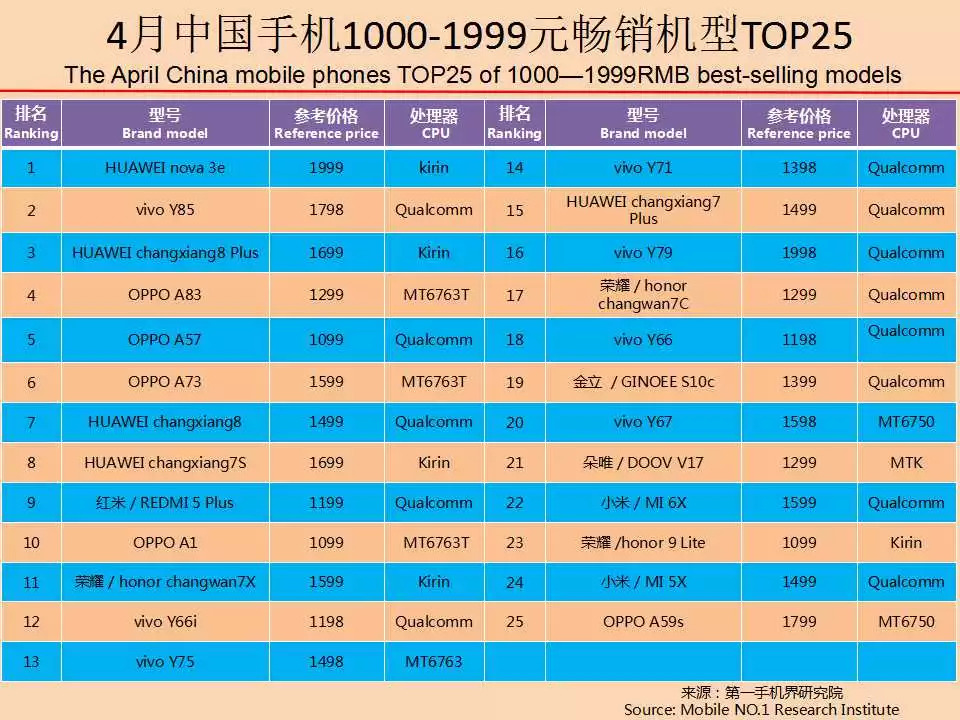荣耀 畅玩7A、荣耀 畅玩7C、vivo Y66、金立 S10c、红米 Note5A、荣耀 畅玩6、朵唯V17、荣耀 9 青春版、vivo Y55、红米 5A分列2018年4月中国热销千元机TOP 20的TOP11至TOP 20。