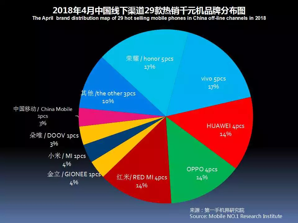 2018年4月在中国大陆线下渠道走量的千元机机型一共有29款,基本分布是:vivo5款、荣耀5款、OPPO4款、华为4款、红米4款,朵唯、小米、金立、中国移动、澳乐达、佰灵通、金盛力各1款。