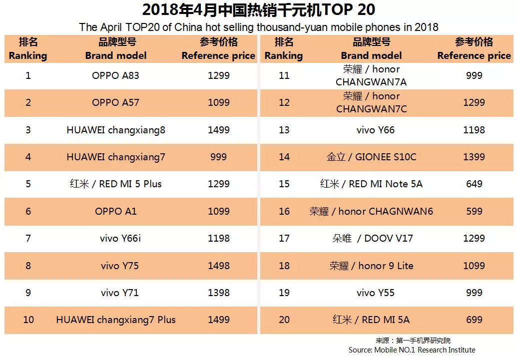 OPPO、华为、vivo、荣耀、红米、康佳、朵唯、小米、金立、中国移动成为2018年4月中国千元机品牌销量TOP10。