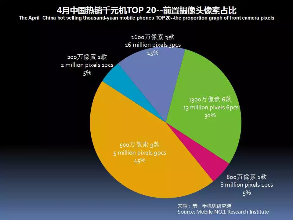 2018年4月中国热销千元机TOP 20中,前置摄像头采用1600万像素的有3款,占比15%,采用1300万像素的有6款,占比30%。