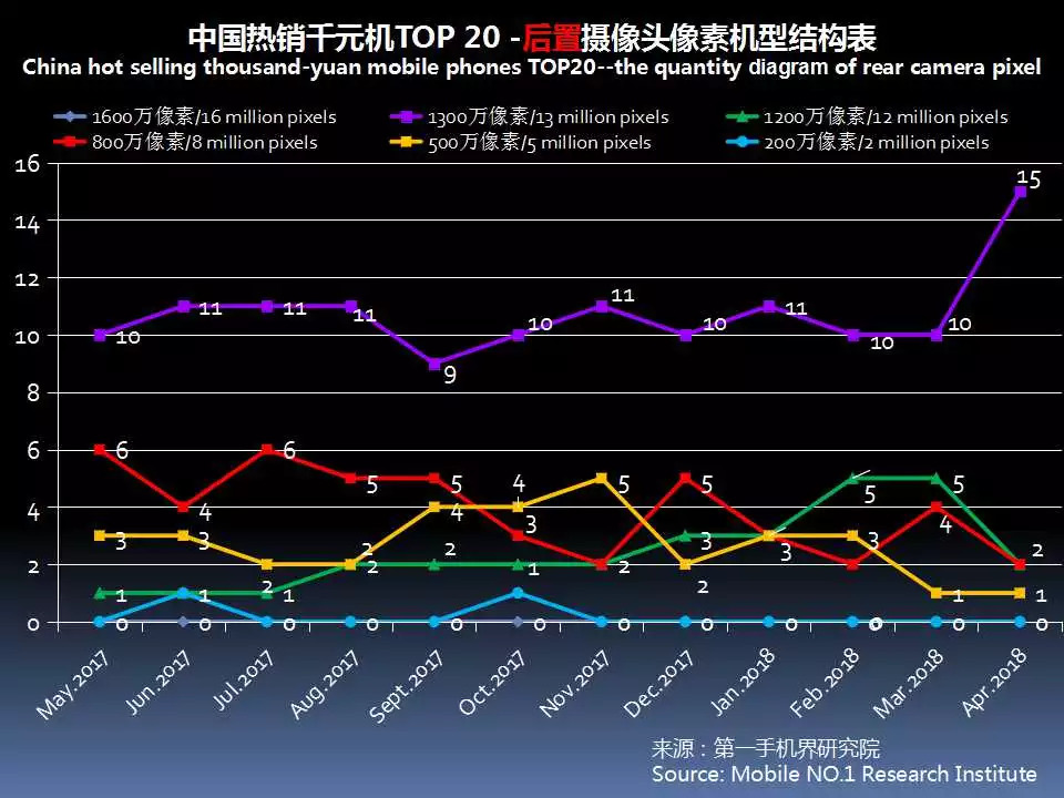 2018年4月中国热销千元机TOP20,后置摄像头采用1300万像素的有15款,占比达75%。