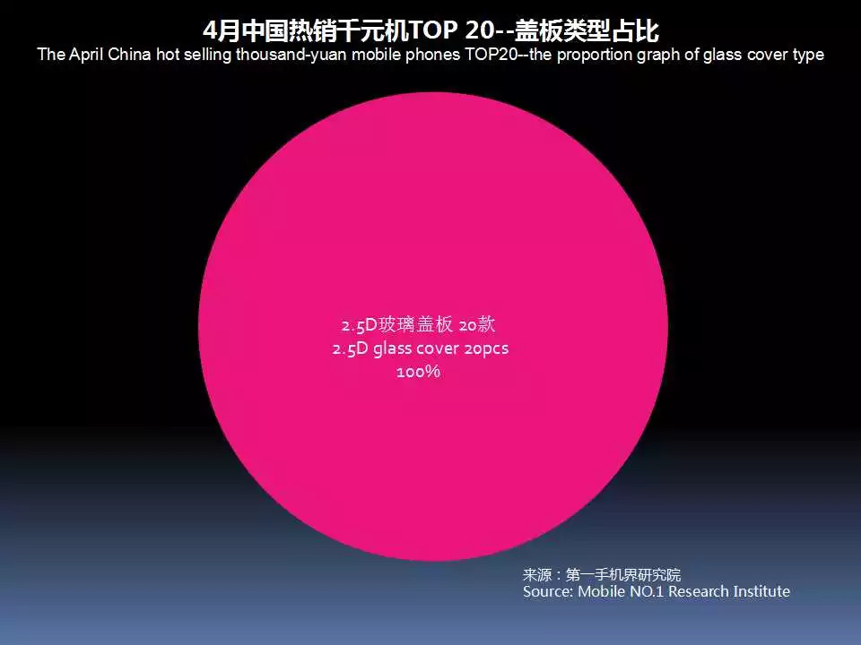 2018年4月中国热销千元机TOP 20中,采用2.5D玻璃盖板的机型的有20款,占比高达100%。