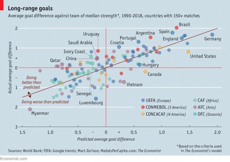 将126个国家在1990年以后参加的所有国际比赛的结果运行到这个模型上后,他们发现,该模型可以解释各国球队平均净胜球变异量中的40%。按照该模型,乌拉圭、巴西、阿根廷和西班牙等国的足球表现超出预期。而对中国来说,结果可能令人难以接受:中国球队的实际表现已经高于该模型预测的水平。