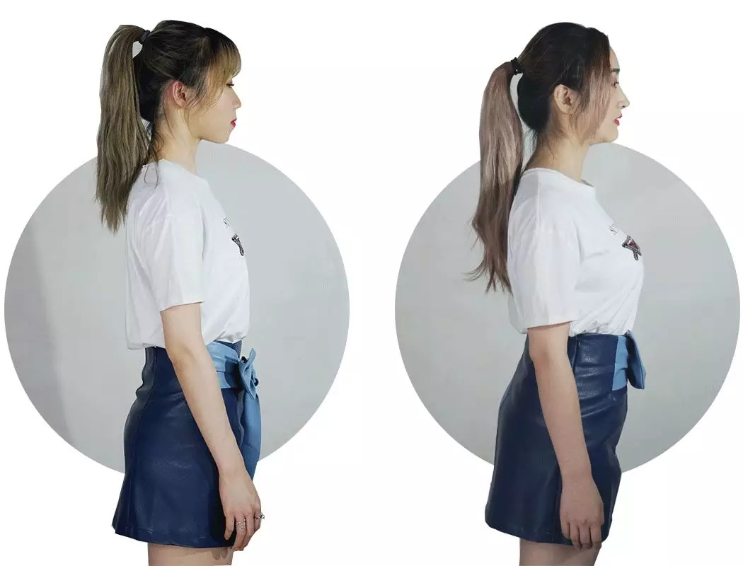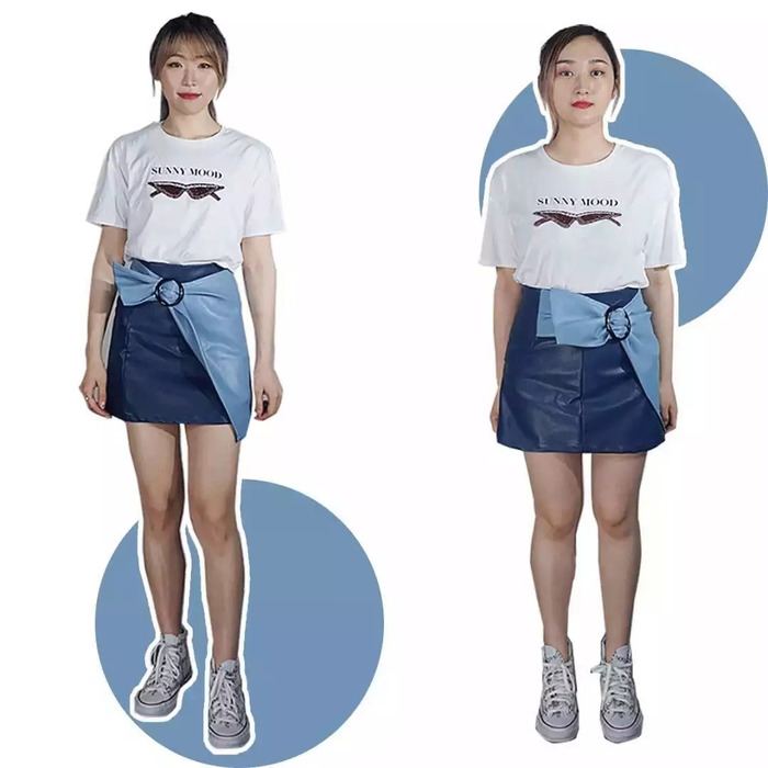 高腰短裙虽然显腿长,但收紧的位置太靠上,视线都集中在上半身,侧面看胸部好像又大了一圈……