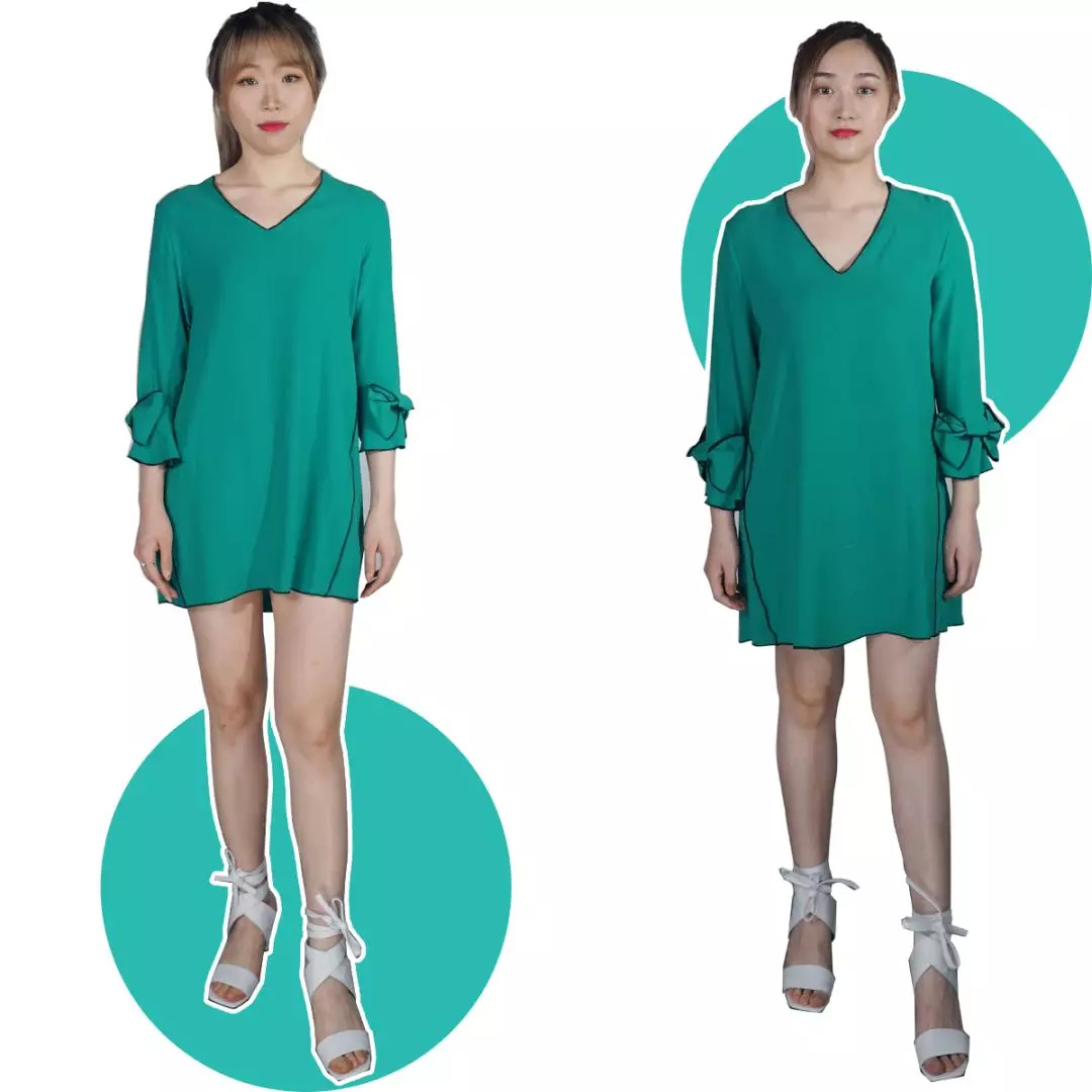 所以领口设计很关键,V领的最好,能延长脖子的线条,露出锁骨还显瘦,胸部就看起来没那么突出。