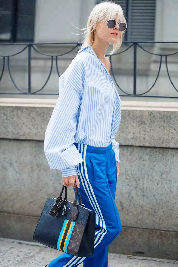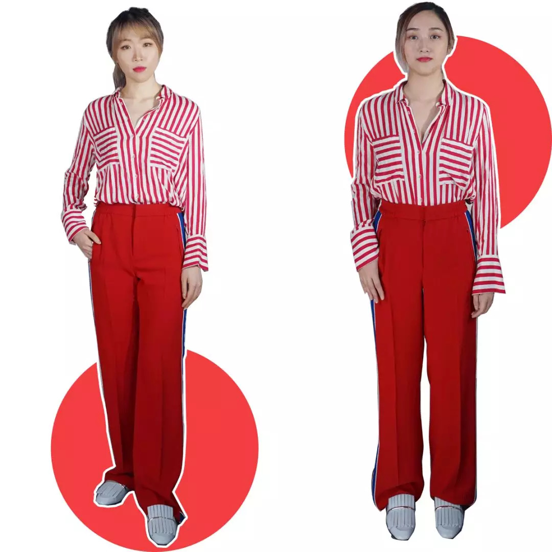 田径裤今年很流行,能平和太过正经的上装。衬衫记得要塞进去穿,显腿长,造型看起来也干练。这套依然小胸胜,但大胸穿起来也不算难看。