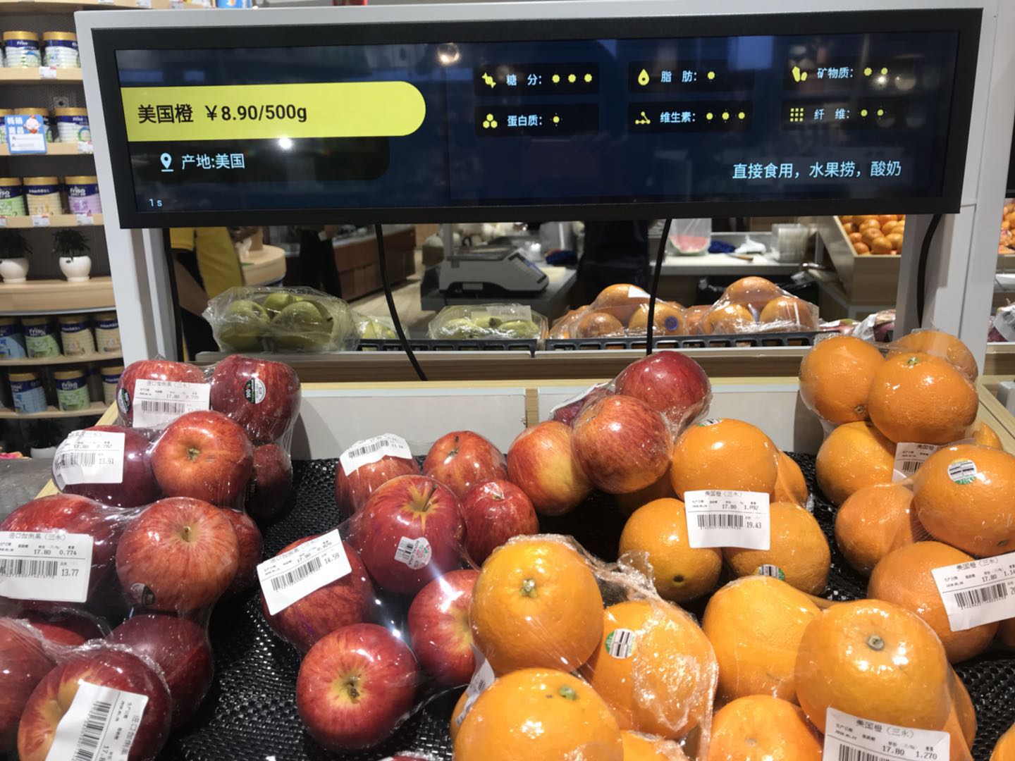 界面新闻记者注意到,苏宁总部的小店店内正中设有一片水果区,每一个单独包装的水果都能够在LED屏上显示产地与重量。拿起一袋橙子,屏幕上显示其产地为美国,重量500g,还标出了糖分、蛋白质、脂肪等相应参数。