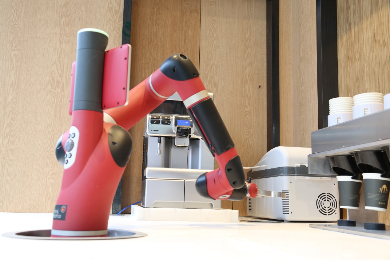 店铺外围,苏宁极物开辟了一块24小时营业的无人咖啡店,制造、运送咖啡由机械臂负责,点单和支付则在苏宁易购上自助完成。