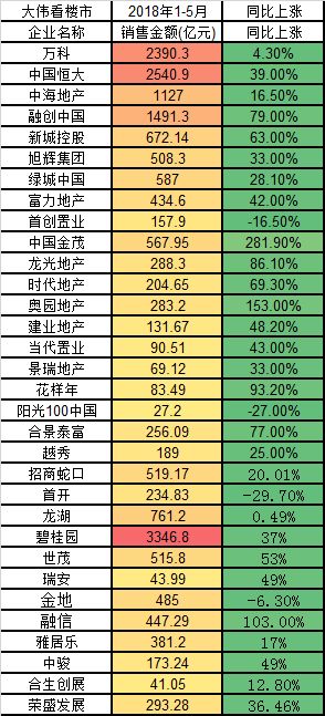 合计有超过3家企业,5个月销售就突破了2千亿,碧桂园、万科与恒大,房企销售在2018年前5月依然刷新历史记录。