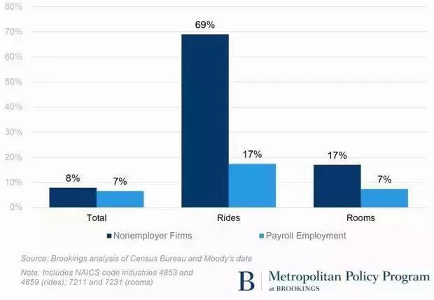 另一方面,共享住房领域增加了17%,但仍然比同行业普通薪水制公司7%的增长幅度要高。大部分(90%以上)零工经济集中在共享出行及住房行业,从业者由个体户以及非公司独资企业所有者构成。