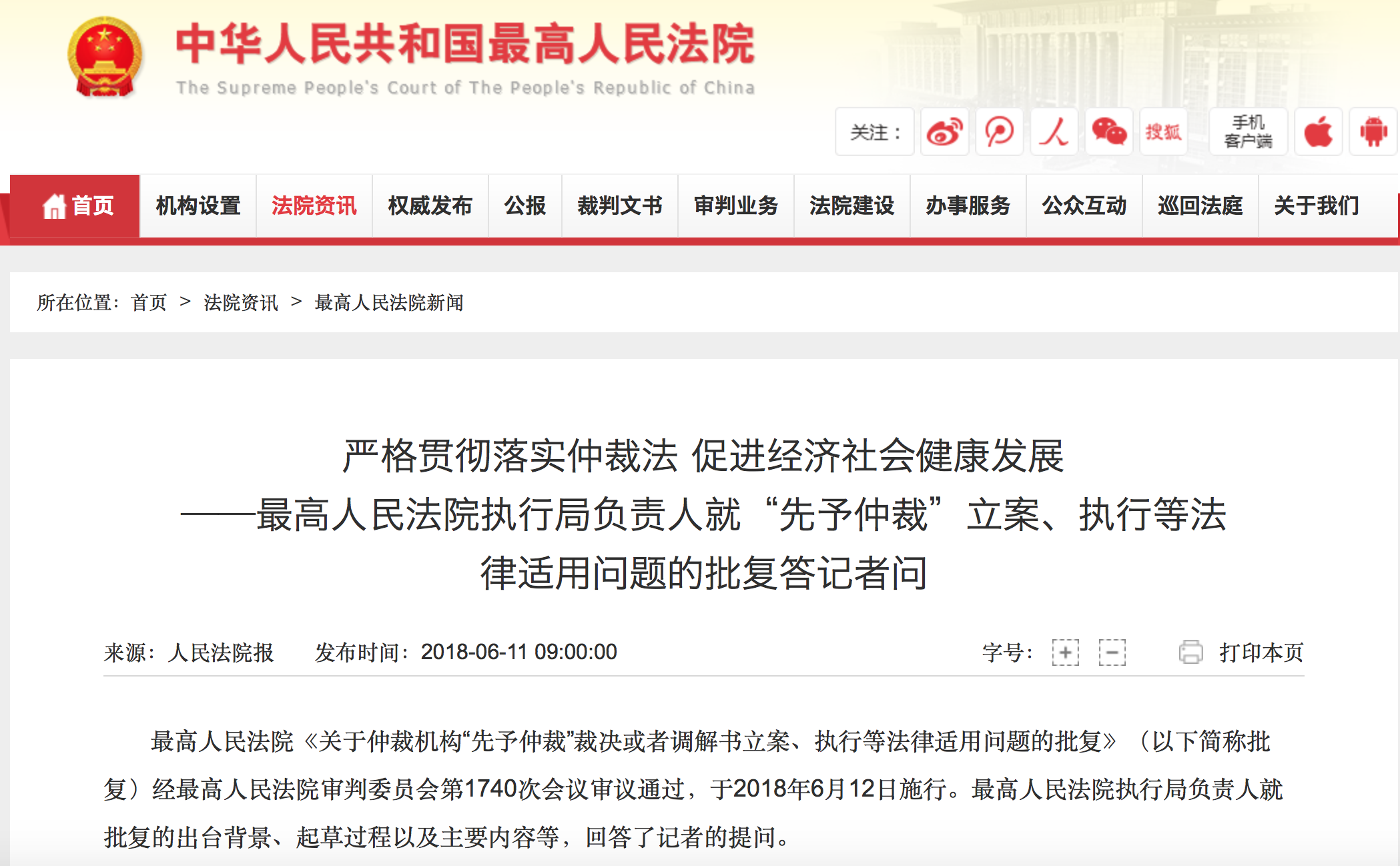 6月11日,最高人民法院(下称 “最高法”)官网发文,就“先予仲裁”立案、执行等法律适用问题的批复答记者问,公布《关于仲裁机构“先予仲裁”裁决或者调解书》(下称 “批复”)经最高法审判委员会审议通过,批复明确仲裁机构在当事人未发生网络借贷合同纠纷时,先予作出的仲裁裁决或者调解书,不应作为执行案件立案受理,将于2018年6月12日施行。