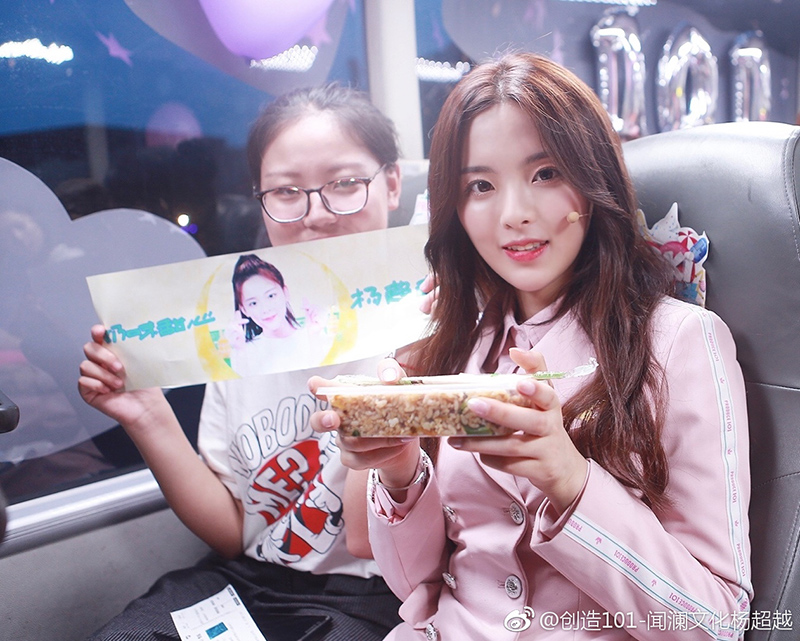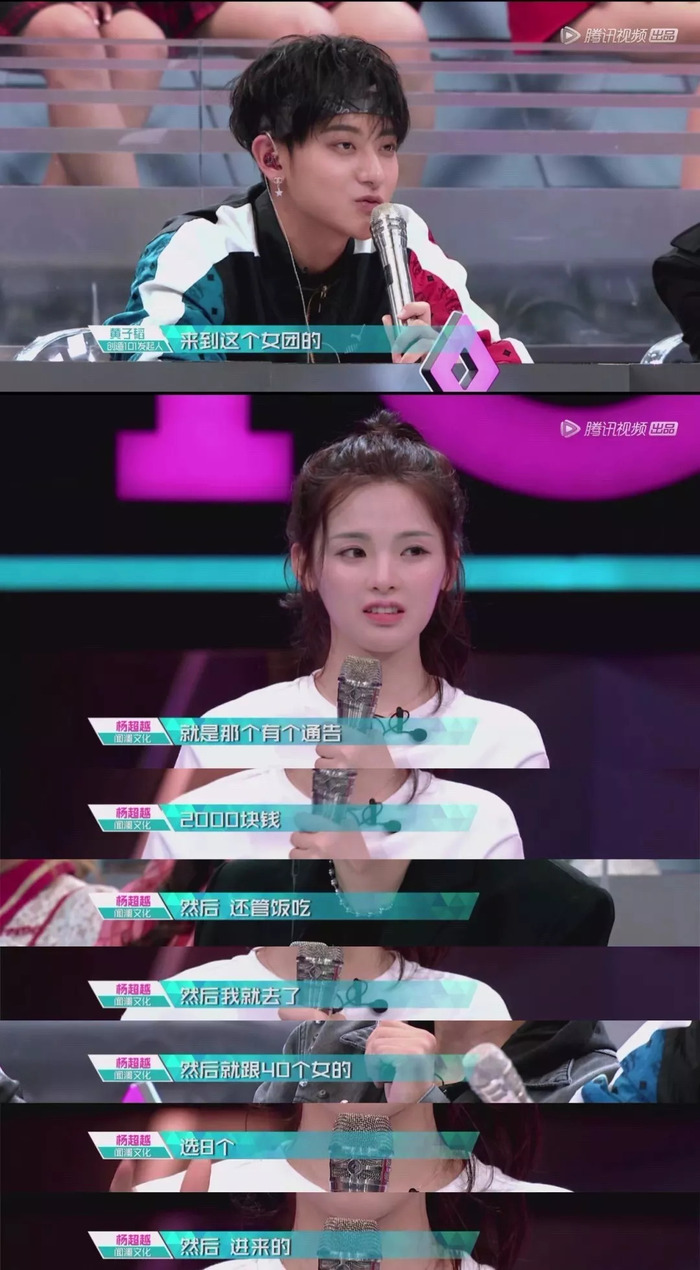 杨超越在《创造101》的第一期节目中就讲到了这个经历,她把参赛原因概括成“看中了2000块的通告费,还管饭吃”。