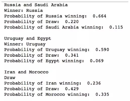 这是他的模型预测最初几场比赛的结果:俄罗斯vs沙特,俄罗斯胜利;乌拉圭vs埃及,乌拉圭胜利;伊朗vs摩洛哥,平局。4天以后就可以验证这个结果是对还是错了。