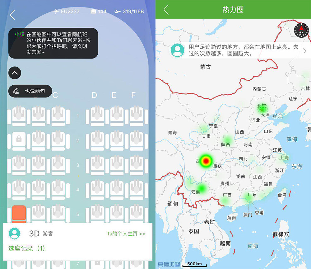 界面新闻记者通过一位航旅纵横的用户查看了此功能。这位乘客5月份曾从成都飞往丽江,在航旅纵横APP中进行了选座。选座页面上,点击其它已选的座位,下方会出现“Ta的个人主页”,点击进去可查看该用户的飞行热力图。